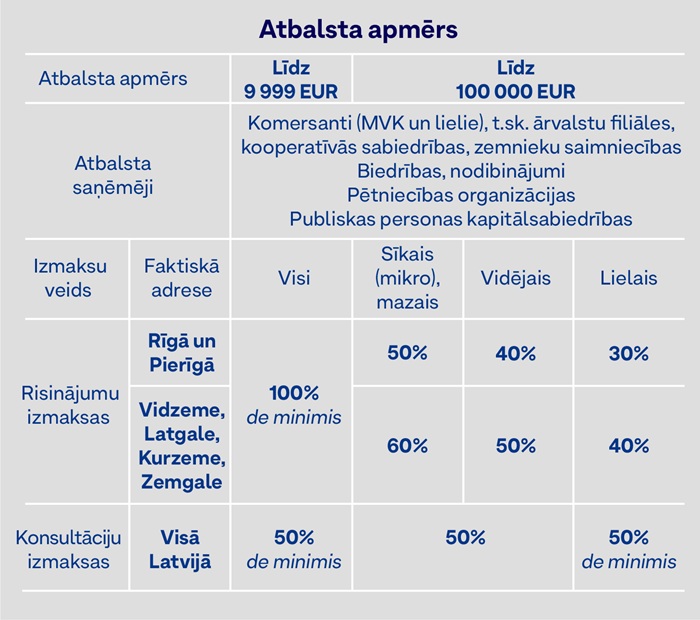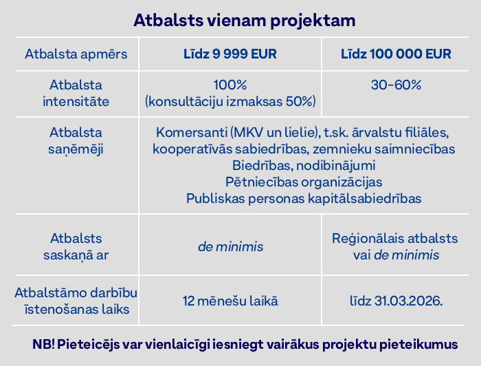 - Lielais grants vienam projektam: līdz 100 000 EUR (atbalsts 30-60% apmērā)
