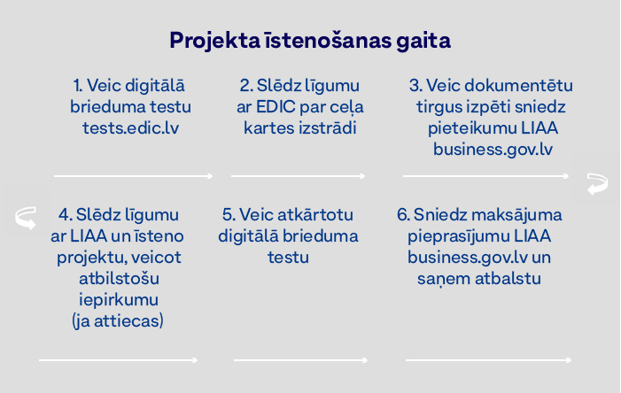 Pirms pieteikuma iesniegšanas LIAA atbalsta saņēmējam jāvēršas EDIC, lai veiktu digitālā brieduma testu un saņemtu digitālās attīstības ceļa karti. EDIC ir Eiropas Digitālās inovācijas centrs, kuru attīsta Latvijas IT klasteris dih.lv.