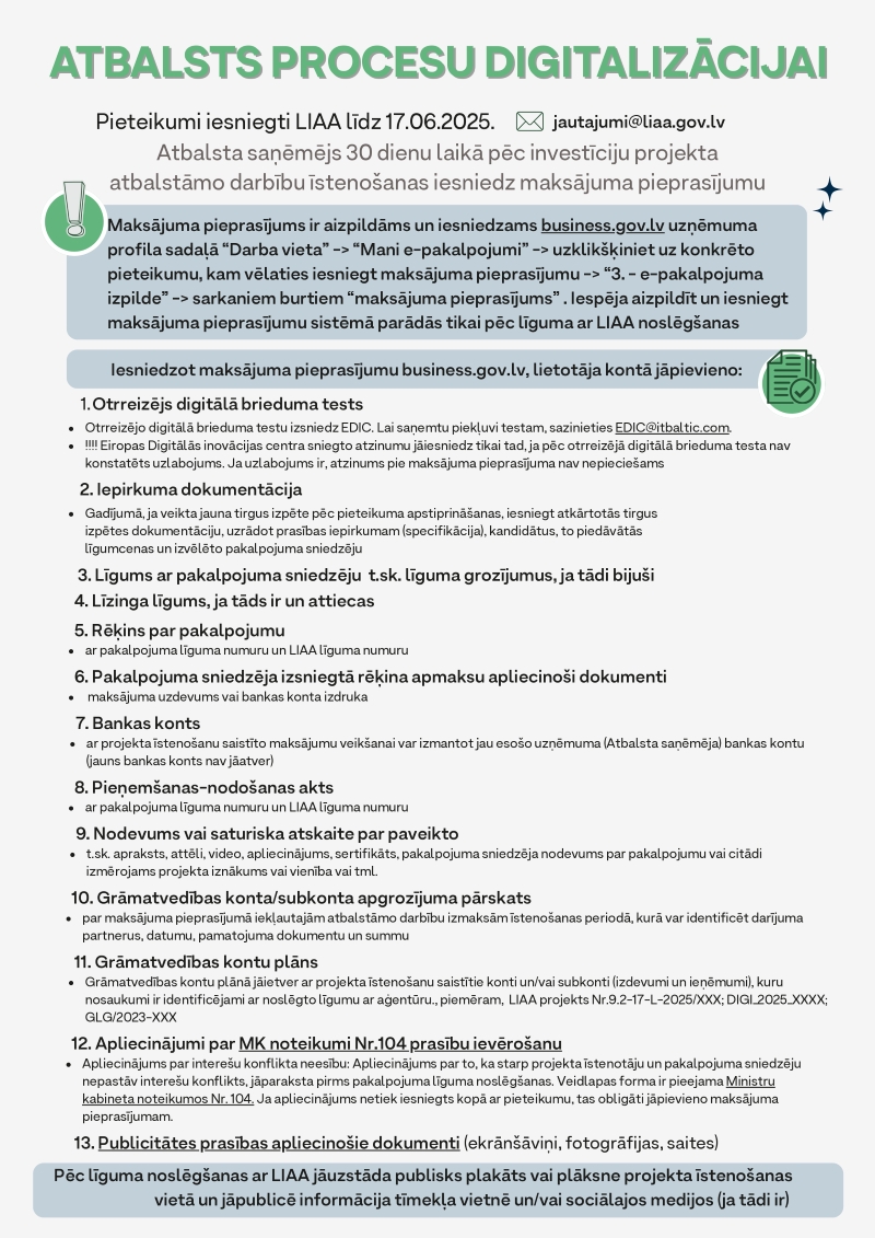- Rēķins par pakalpojumu (ar pakalpojuma līguma numuru un LIAA līguma numuru);