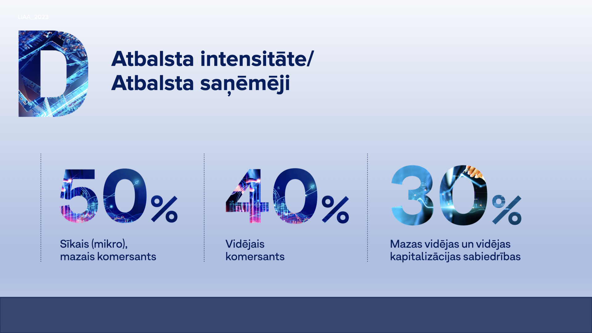 Latvijas Investīciju un attīstības aģentūra (LIAA) turpina sniegt atbalstu Latvijas uzņēmējiem, lai veicinātu komercdarbībā izmantoto procesu digitalizāciju, kā arī uzsāk sniegt jaunu atbalstu – mākslīgā intelekta risinājumu izstrādei un ieviešanai. Ar pieejamo grantu atbalstu uzņēmēji var digitalizēt dažādus uzņēmējdarbībā izmantotos procesus (administratīvos, personāla, resursu, IKT un citus) un ieviest dažādus mākslīgā intelekta risinājumus. Īstenotie digitalizācijas projekti palīdzēs veicināt Latvijas uzņēmēju konkurētspēju un paaugstināt produktivitāti.