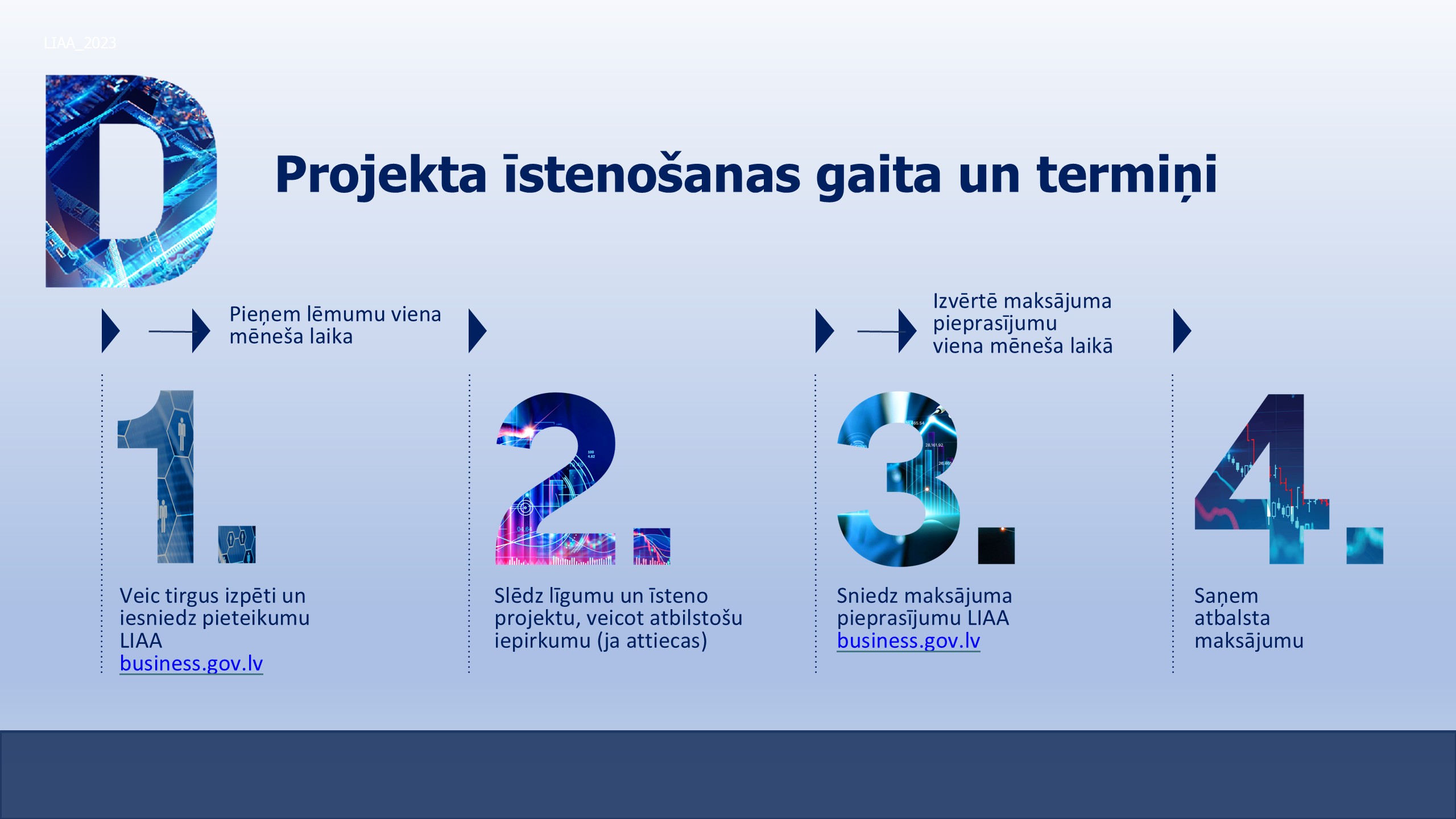 - LIAA viena mēneša laikā izvērtēs pieteikumu un par rezultātu pieteicējs tiks informēts e-pastā. Sekmīga vērtējuma rezultātā atbalsta saņēmējs noslēdz līgumu ar LIAA.