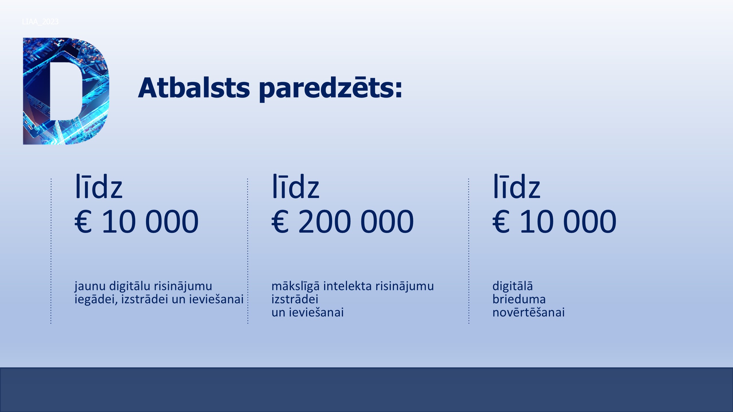 Atbalsts (finansējums) paredzēts digitālo produktu, pakalpojumu, lietojumprogrammu, procesu izstrādei, ieviešanai vai pārveidošanai, kā arī mākslīgā intelekta risinājumu izstrādei un ieviešanai.
