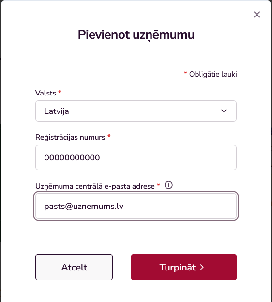 e-pasta adrese. Uzņēmuma pārstāvis, kurš ar norādīto e-pasta adresi izveidos fizskas personas profilu, tiks pievienots pie uzņēmuma profila.