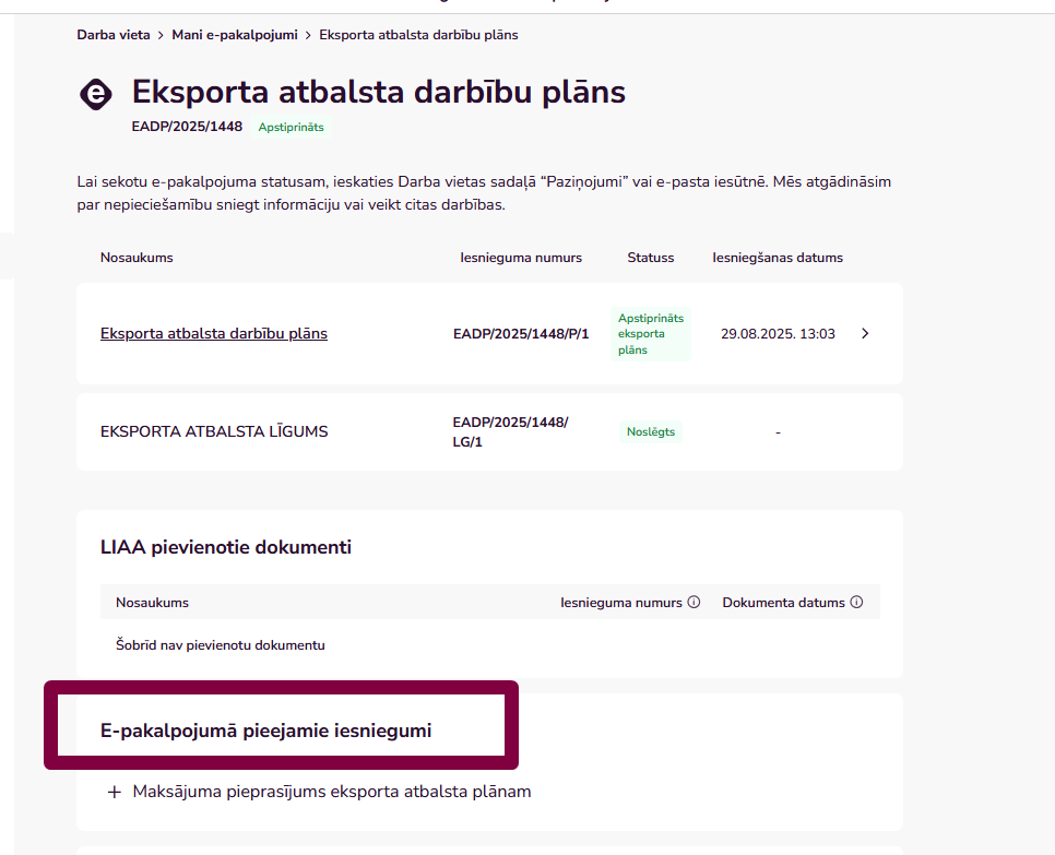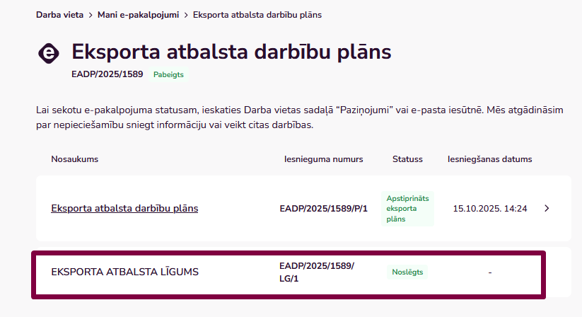 Sistēmā ir pieejami tikai abpusēji parakstītie līgumi. Līgumus parakstīšanai LIAA nosūta uz klienta e-pastu. Līgums tiek parakstīts ārpus sistēmas. Klientam sistēmā tas ir pieejams pēc abpusējas parakstīšanas apstiprinātajā e-pakalpojumā.