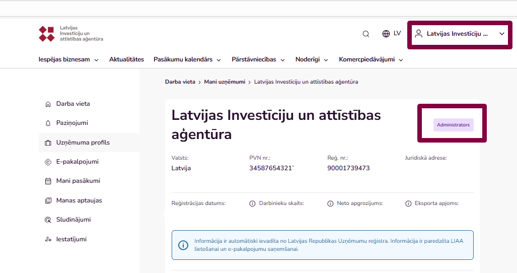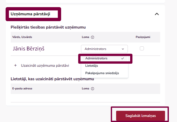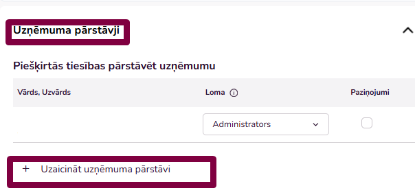Administratora tiesības var piešķirt arī personai, kas vēl nav pievienojusies pie uzņēmuma profila: sadaļā "Lietotāji, kas uzaicināti pārstāvēt uzņēmumu" ir jāspiež poga "Uzaicināt uzņēmuma pārstāvi" jānorāda uzņēmuma pārstāvja