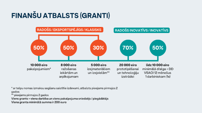 These are various financial and non-financial aid measures targeted at young businesses to strengthen the viability of innovative, technological, creative and exportable Latvian businesses, increase growth potential and promote exports of goods and services produced in Latvia.