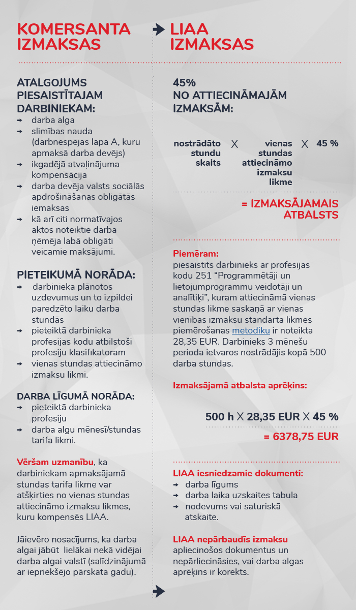 Atbalsta summa = 45% x (likmedarbinieks1 x darba stundasdarbinieks1 +likmedarbinieks2 x darba stundasdarbinieks2+ …..)