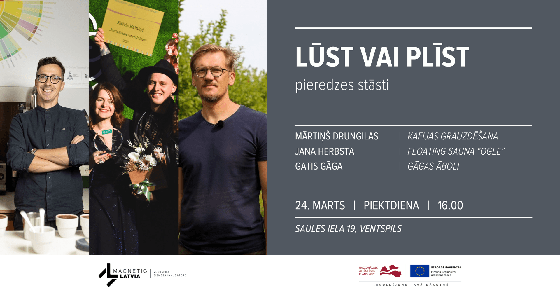 Ikviens interesents ir aicināts apmeklēt LIAA Ventspils biznesa inkubatora organizēto pieredzes un iedvesmas stāstu pasākumu LŪST VAI PLĪST. Pasākumā dzirdēsim 3 uzņēmēju stāstus par motivāciju un vēlmi uzsākt savu uzņēmējdarbību, par kļūdām, no kurām mācīties ikvienam, par neveiksmēm, kuras piedzīvotas, bet neskatoties uz šo visu, ir vēlme nepadoties, iet uz priekšu un mācīties no kļūdām, lai tur lūst vai plīst. Savos stāstos ar mums dalīsies: