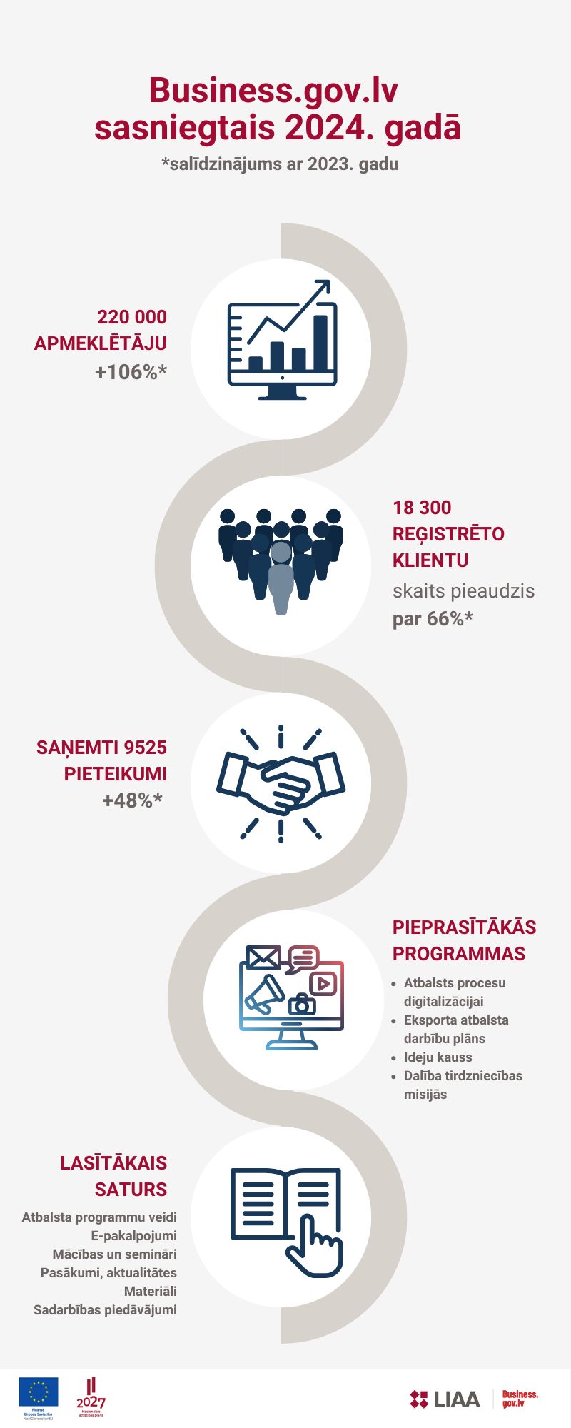 - business.gov.lv lasītāju skaits aug, tas ir pārsniedzis 220 tūkstošu robežu un ir par 106% lielāks nekā 2023. gadā;